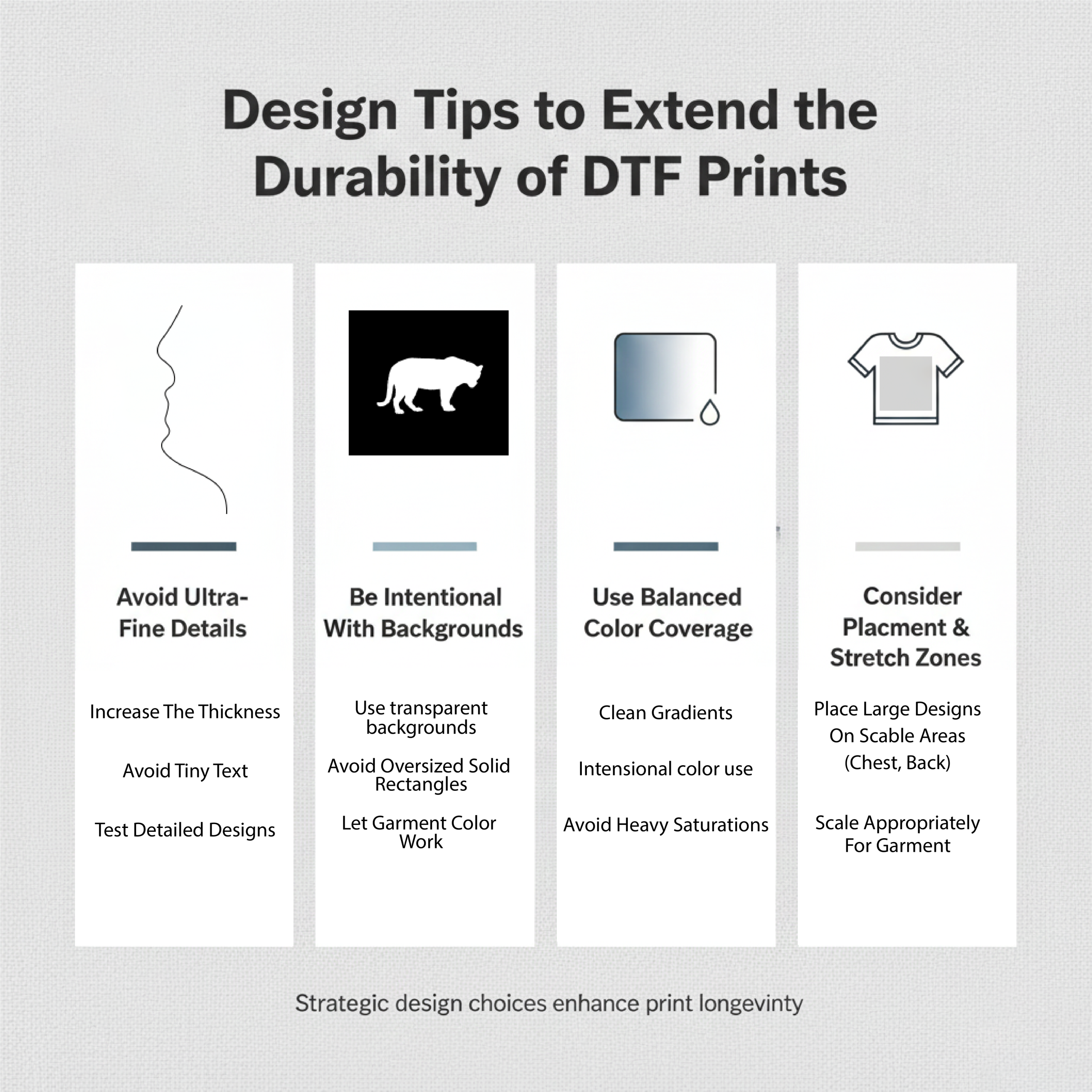 Great durability isn’t just about production — design choices matter too. Here are proven design best practices to help DTF prints last longer: