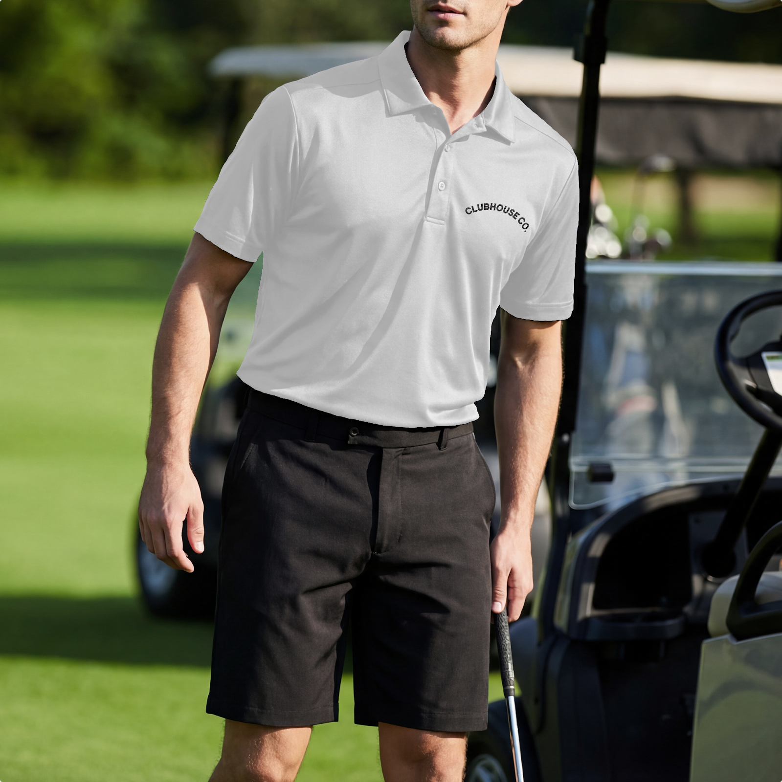 Men’s custom UV performance golf polo (ST520) mockup with embroidered logo, styled on-course — ideal for building a premium golf apparel brand.