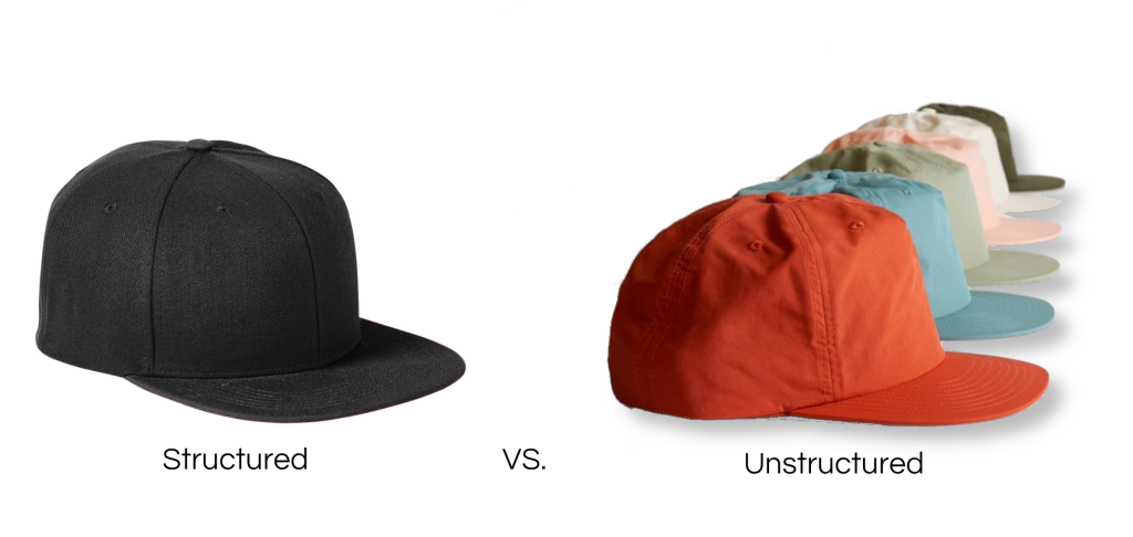 Another way to think about them is when you take them off your head and set them at rest. A structured hat will continue to look the same and maintain its shape and an unstructured hat will collapse under the weight of gravity without your head to fill it.